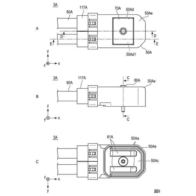 図9は、プラグハーネス3Aを示した図であり、Aは平面図、Bは左側面図、Cは底面図である。