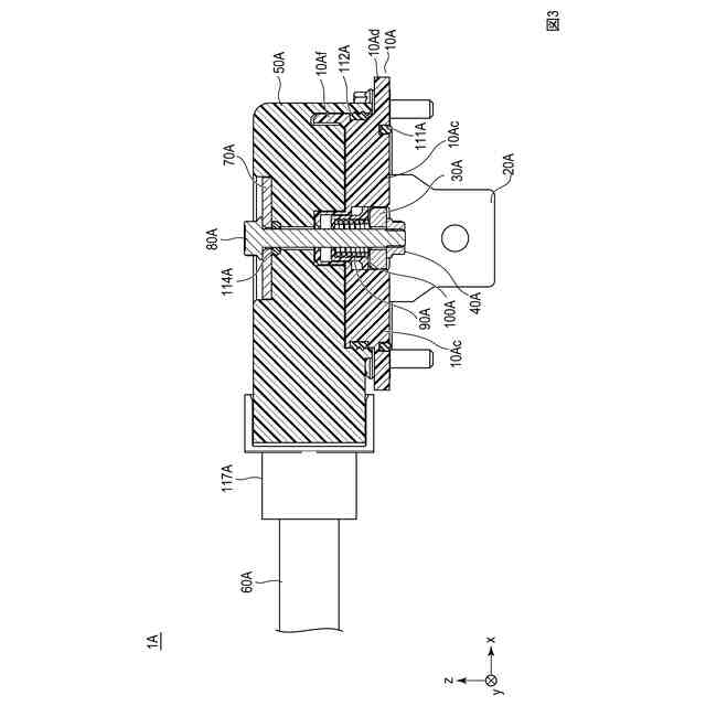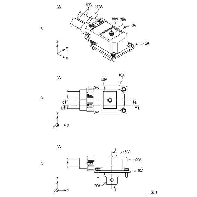 以下、本開示の第1実施形態に係る接続体について図面を参照して説明する。なお、同じ機能を有する構成部には同じ番号を付し、重複説明を省略する。図1は、第1実施形態に係る接続体の一実施例を示した図であり、Aは斜視図、Bは平面図、Cは左側面図である。図2は、接続体1Aの分解斜視図である。図3は、図1BのK-K断面図である。図4は、図1BのL-L断面図である。