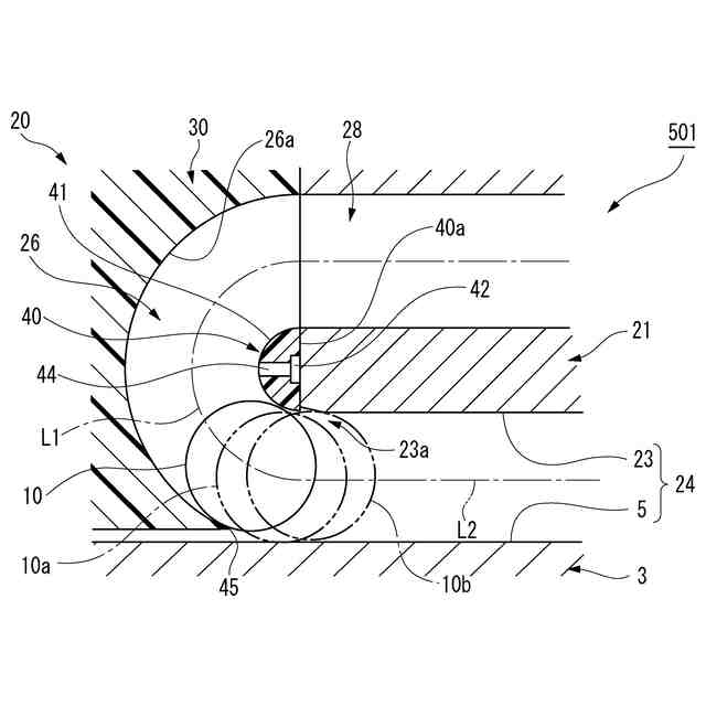 前記方向転換路内における前記ボールに対する遊び代をDbとし、前記オフセットの量をDoとしたとき、「2×Do/Db>1」の関係を有する、