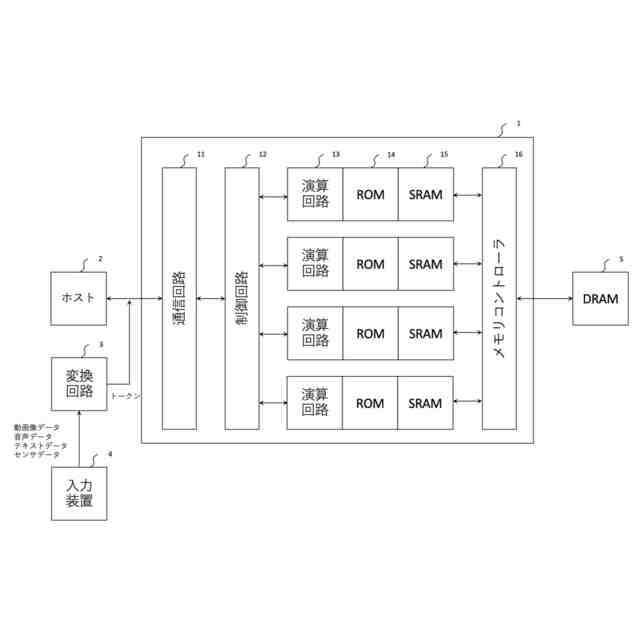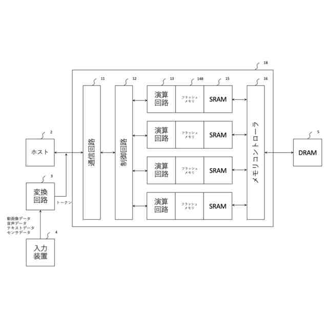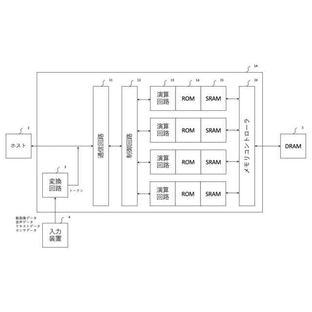 従来の半導体集積回路では、AIのパラメータは、更新可能なようにRAM(Random Access Memory)に保存されている。近年普及し始めたLLM(Large Language Model)のような大規模モデルのパラメータは、データ量が多いため、外部のDRAM(Dynamic RAM)に保存するのが一般的であるが、AI処理の速度がDRAMのデータ転送速度(バンド幅)に律速されるという問題があった。