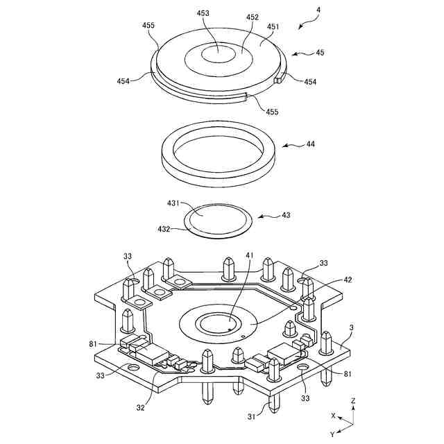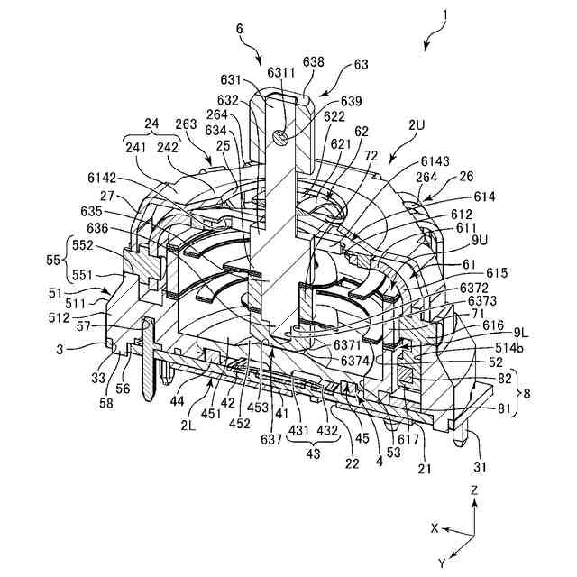 ユーザーから操作軸550に対して任意の方向への傾倒操作が印加されると、操作軸550の傾倒動作に伴い、第1の回動部材530および第2の回動部材540が回動する。第1の回動部材530および第2の回動部材540の回動角度のそれぞれは、センサー580によって検出され、操作軸550に対するユーザーの傾倒操作に応じた方向情報の入力が提供される。また、ユーザーから操作軸550に対して押下操作が印加されると、操作軸550と係合している第2の回動部材540が下方に変位し、第2の回動部材540がプッシュスイッチ590を押下する。これにより、操作軸550に対するユーザーの押下操作に応じた押下情報の入力が提供される。