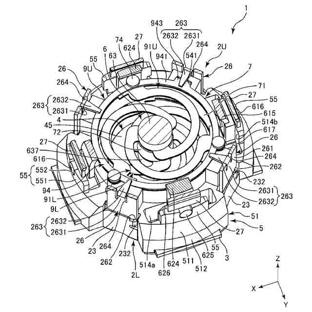 第2のスリット孔を有し、前記第1の軸方向と直交する第2の軸方向回りに回動可能に、前記ハウジングに保持された第2の回動部材と、
