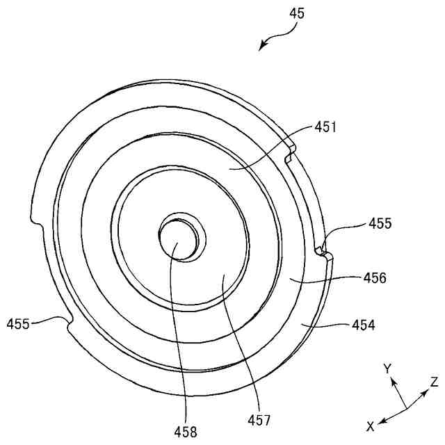 作動部材560は、底面が皿状に湾曲された基部561と、基部561の中央部に形成され、操作軸550の下端部が挿入される筒状のボス部562と、基部561の外周部から外側に突出する円弧部563と、を備えている。このような多方向入力装置500では、ユーザーが操作軸550に対して傾倒操作を印加した場合、操作軸550の傾倒角度が小さい初期段階においては、作動部材560が底板510上をスライドする。その後、操作軸550の傾倒角度が一定値を超えると、作動部材560の円弧部563の下面が、底板510上に形成された突部510bに当接しながら作動部材560が傾斜し、コイルバネ570の弾性力に抗して、作動部材560が操作軸550の軸方向に持ち上げられる。その後、操作軸550に対する傾倒操作が解除されると、コイルバネ570の弾性復元力と基部561の底面の形状によって、操作軸550が直立の中立状態に復帰する。このように、作動部材560は、操作軸550を直立の中立状態で弾性的に保持する機能を提供している。