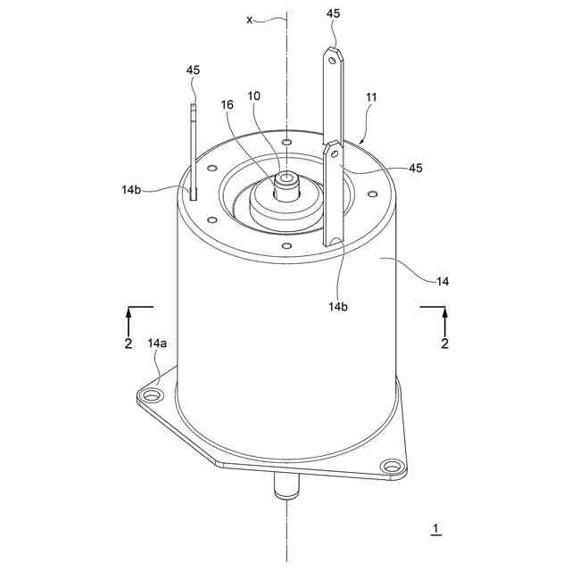 なお、以下のモータ1の実施形態の説明において、軸線xに沿った方向(以下、「軸方向」という。)における一方の側を上側、一方の側の反対の他方の側を下側と規定する。軸方向において規定されるこれら上側及び下側は、重力方向における上下関係とは必ずしも一致しない。また、軸線xに垂直な方向にモータ1の径方向が規定される。この径方向において、軸線xから遠ざかる側を径方向における外側(外周側)と規定する一方で、軸線xに近づく方向を径方向における内側(内周側)と規定する。さらに、軸線x周りにモータ1の周方向が規定される。