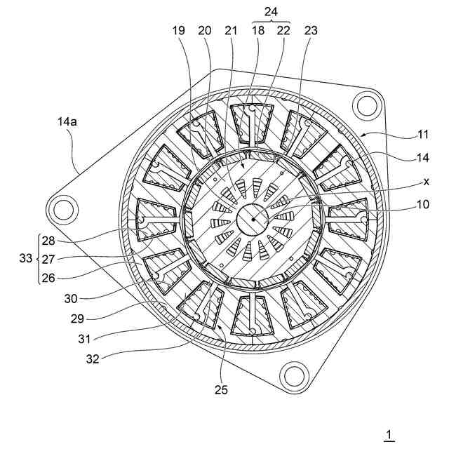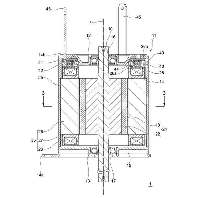 図1~図3を併せて参照すると、モータ1は、例えば軸線xを中心軸線とする円柱状のシャフト10を備えている。シャフト10は、ハウジング11に固定される2つの軸受12、13に回転自在に支持されている。軸受12、13は、シャフト10とハウジング11との間に例えば圧入などにより取り付けられている。軸受12、13は例えば玉軸受である。この例では、シャフト10は、ハウジング11の上端より上側よりも、ハウジング11の下端よりも下側により大きく突出している。