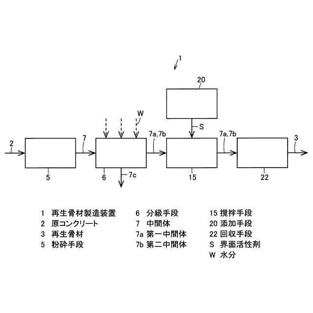 【解決手段】再生骨材3の製造方法は、原コンクリート2を粉砕する粉砕工程と、粉砕工程において粉砕された成分である中間体7を、水洗しつつ分級する分級工程と、分級工程により分級された中間体7を撹拌しつつ界面活性剤Sを添加する添加工程と、を備え、界面活性剤Sにより表面がコーティングされた中間体7を再生骨材3として回収する。