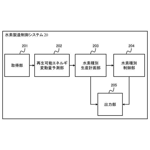 以下、図面に基づいて、本発明の実施の形態を説明する。本実施形態では、環境負荷の異なる水素の製造を計画する水素製造制御システムを開示する。この水素製造制御システムは、再生可能エネルギを用いた電力量の変動量を見積もり、再生可能エネルギ発電装置からの電力量が安定的な場合は環境負荷の低い水素(第1水素、クリーン水素)を製造し、再生可能エネルギ発電装置からの電力量が不安定な場合は、系統電力などを用いて環境負荷の高い水素(第2水素、グレー水素)を製造する水素種別生産計画を作成する。