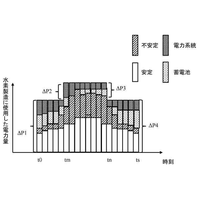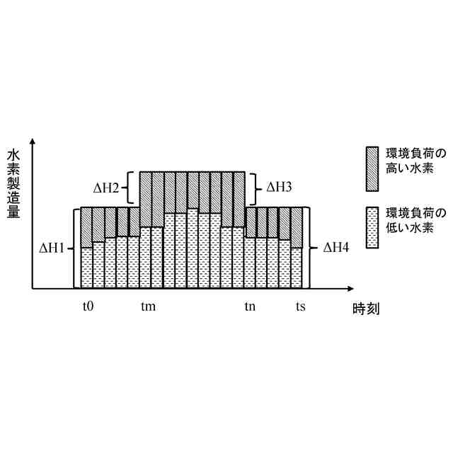 水電解装置は、発電量(発生させる電力量)の変動する再生可能エネルギを用いて、水素を生産する必要がある。しかし、水電解装置へ入力される電力量の変動により、水電解装置の劣化が懸念される。さらに、再生可能エネルギからの電力量は天候などにより変動するため、環境負荷の異なる水素を安定的に計画的に製造することが難しくなる。