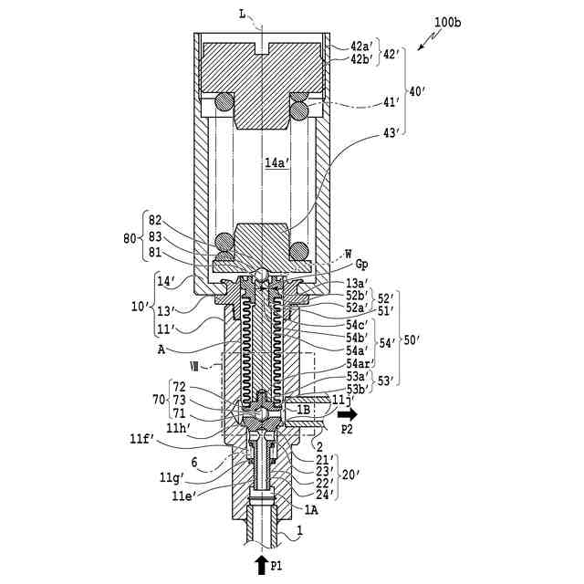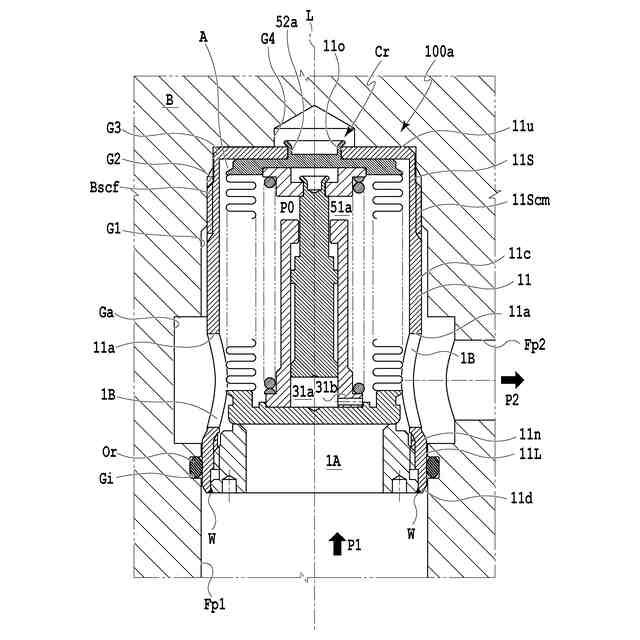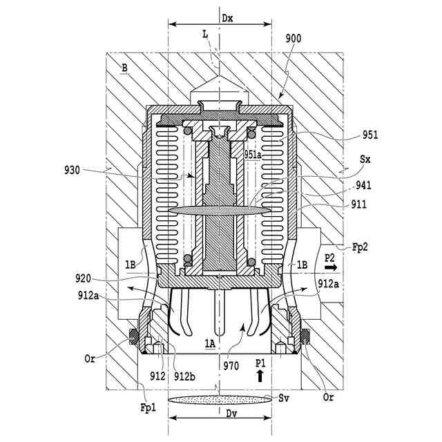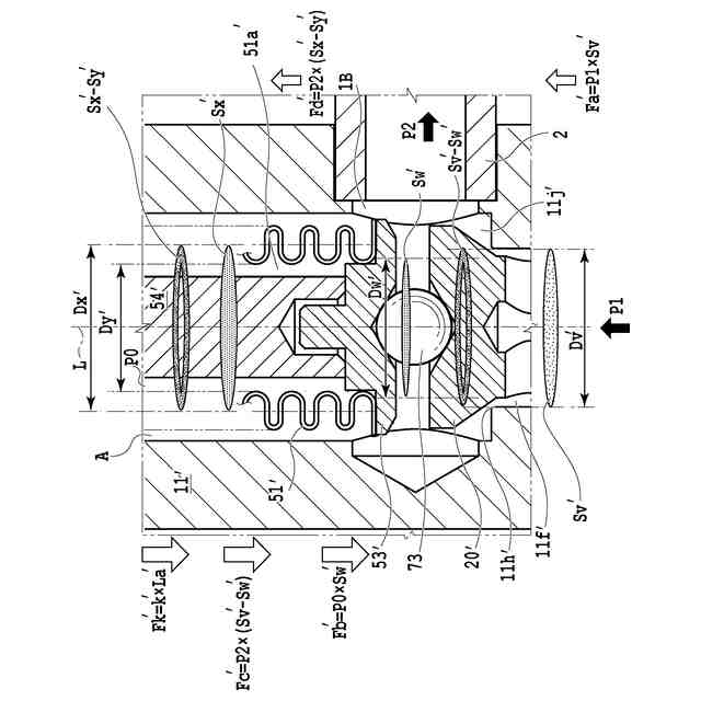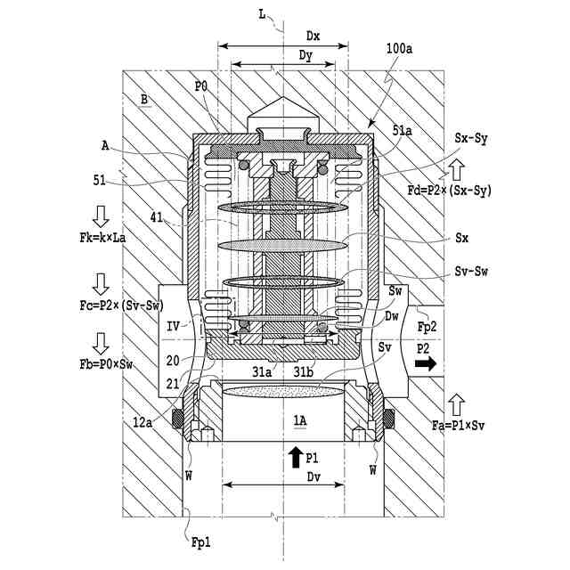この問題を解消するために、従来の圧力調整弁900において、感圧用ベローズ951の有効受圧径面積Sxと、一次側ポート1Aである弁ポートの口径Dvに基づいて算出した受圧面積Svとを一致させること(Sx=Sv)、つまり、感圧用ベローズ951の有効受圧径Dxと、弁ポートの口径Dvとを一致させること(Dx=Dv)により、二次側圧力P2の影響をキャンセルさせ、二次側圧力P2の影響を排除している。