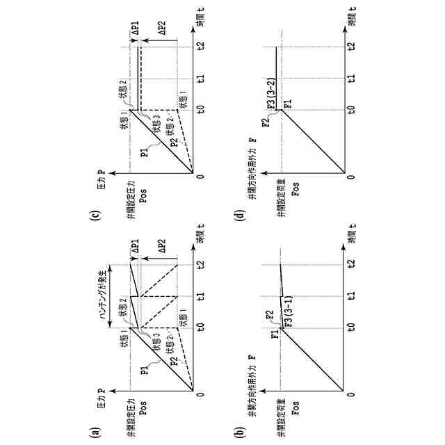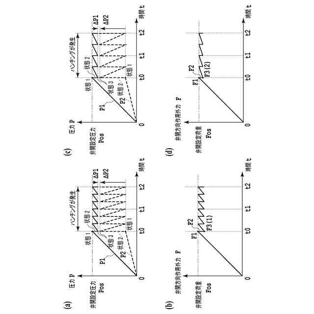 しかしながら、従来の圧力調整弁900では、一次側圧力P1が、弁開設定圧力を超えて弁開状態となった際に、弁体920周辺に圧力変化が生じる。具体的には、図9に示すように、弁体920周辺において、一次側圧力P1は、流体の流出により圧力低下が生じる一方、二次側圧力P2は流体の流入により圧力上昇が生じる。この際、詳細は後述するが、感圧用ベローズ951の有効受圧径面積Sxと、弁ポートの口径Dvに基づいて算出した受圧面積Svとを一致させていることに起因して、弁体920の弁開方向に作用する外力Fが比較的大きく低下する結果、弁体920は、弁閉方向に移動する。その後、弁閉状態となった瞬間に、一次側圧力P1が、弁開設定圧力を超えるため、再び、弁開状態となる。このように、従来の圧力調整弁900では、弁開直後において、依然として、比較的高頻度にハンチングが生じるおそれがあった(以下、「従来の問題点(弁開直後に高頻度のハンチング発生)」という)。