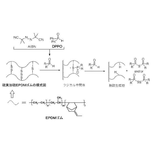 一方、硫黄架橋ゴムの構造内の硫黄結合を脱硫剤(再生剤)により化学的に切断して脱硫する方法(化学的脱硫)は、硫黄結合に対し選択的に切断が進行するため、主鎖の切断が発生しにくい。そのため、化学的脱硫による再生脱硫ゴムは、新品原料ゴムと同等の分子量を保つことが可能となり、物性低下が抑制される。また、温和な条件で脱硫を行うことができる。
