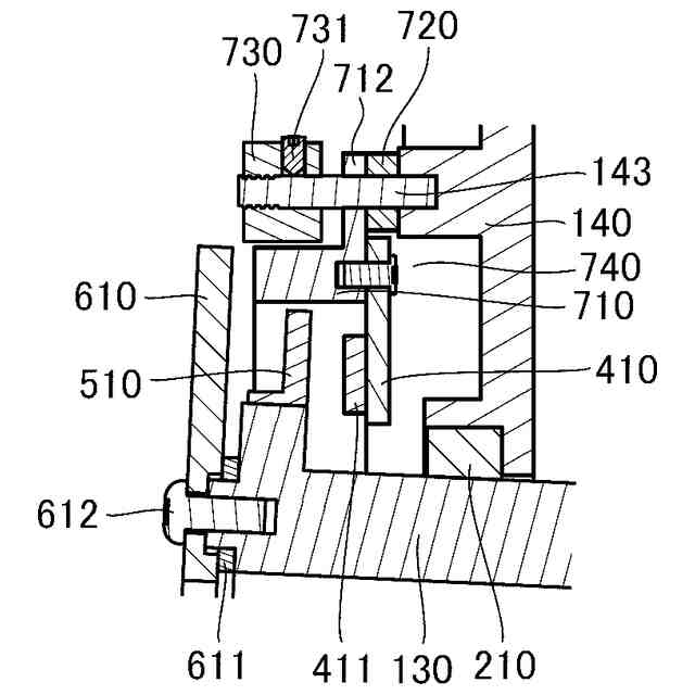 実施形態2の撮像装置における外部からの衝撃などによってチルト軸が傾いたときのエンコーダ周辺の詳細断面図である(その二)。