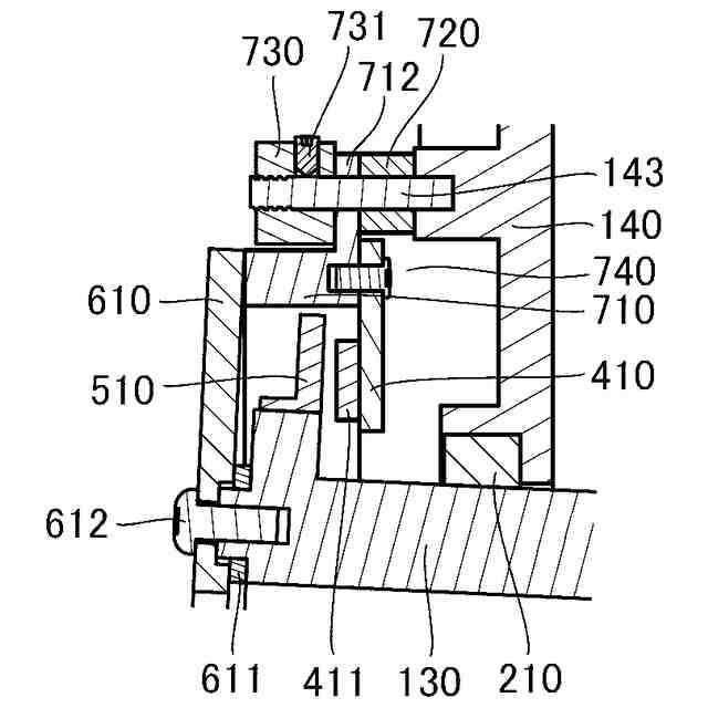 実施形態2の撮像装置における外部からの衝撃などによってチルト軸が傾いたときのエンコーダ周辺の詳細断面図である(その一)。