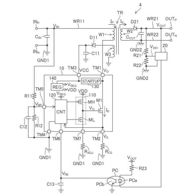 以下、本開示の実施形態の例を、図面を参照して具体的に説明する。参照される各図において、同一の部分には同一の符号を付し、同一の部分に関する重複する説明を原則として省略する。尚、本明細書では、記述の簡略化上、情報、信号、物理量、機能部、回路、素子又は部品等を参照する記号又は符号を記すことによって、該記号又は符号に対応する情報、信号、物理量、機能部、回路、素子又は部品等の名称を省略又は略記することがある。例えば、後述の“M1”によって参照されるスイッチングトランジスタは(図2参照)、スイッチングトランジスタM1と表記されることもあるし、トランジスタM1と略記されることもあり得るが、それらは全て同じものを指す。