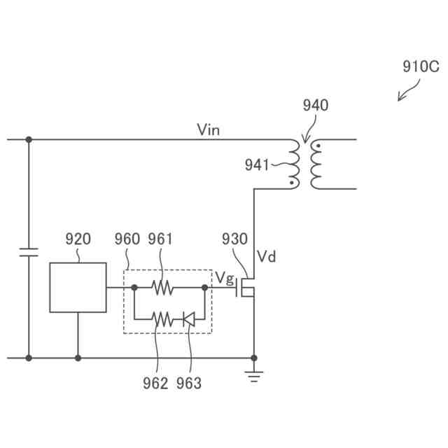 前記スイッチングトランジスタがオン状態からオフ状態に切り替えられるときにおける前記第1端子の電圧上昇のスルーレートが、前記外部抵抗の抵抗値の調整を通じて、調整される