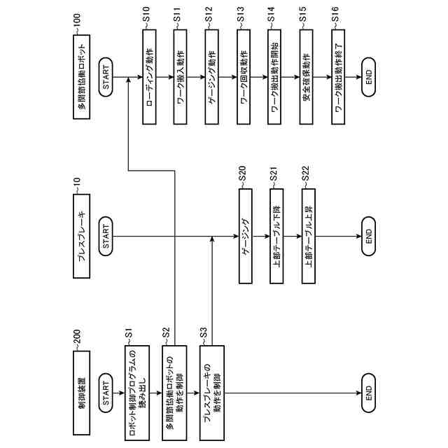 このような問題を解決する一つの手段として、ユーザとの接触を感知すると動作を停止する協働ロボットを、曲げロボットとして採用することが考えられる。このような協働ロボットを採用することにより、ユーザの負傷リスクを低減させることが可能となり、安全柵を排除することが可能となるからである。しかしながら、協働ロボットが安全であるとしても、協働ロボットによって搬送されるワークは鋭利な部位を有することが多いため、搬送中のワークにユーザが接触し、負傷するおそれがあるという更なる問題が生じる。
