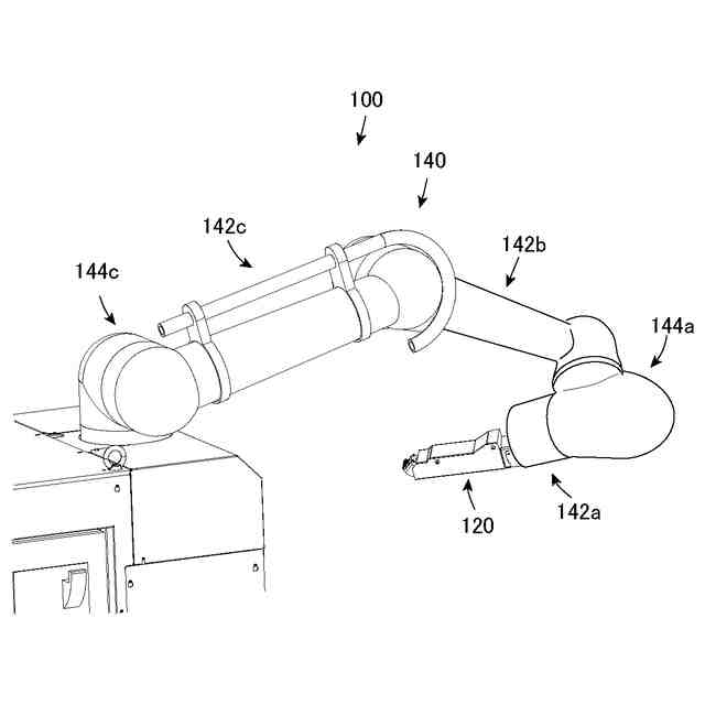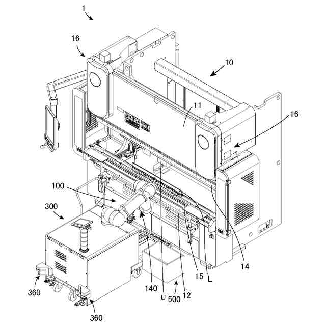 従来、プレスブレーキのパンチとダイを搭載する金型搭載用ストッカと、曲げロボットが使用するハンドを搭載するハンド搭載用ストッカとを備えた金型・ハンド格納装置が知られている(例えば、特許文献1)。特許文献1のシステムでは、プレスブレーキの側方に金型・ハンド格納装置が設置されると共に、プレスブレーキ及び金型・ハンド格納装置の前方に曲げロボットが設置されており、これらプレスブレーキ、金型・ハンド格納装置及び曲げロボットの全体が安全柵で包囲されている。