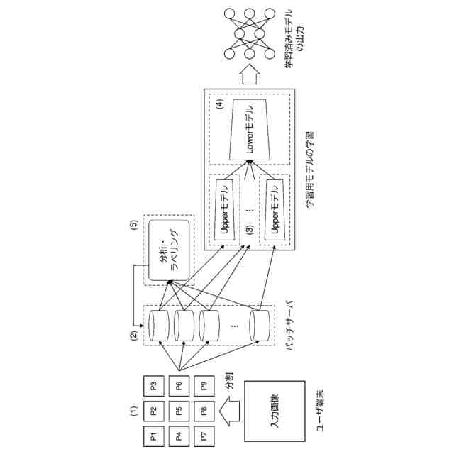 ユーザ端末102は、学習に用いられる画像の入力に用いられる端末である。パッチサーバ110は、ユーザ端末102を用いて入力された画像が分割されることによって生成される複数のパッチを保管するためのストレージサーバである。Upperサーバ112及びLowerサーバ114は、学習用モデルとしてのUpperモデル及びLowerモデルを夫々保管するサーバである。