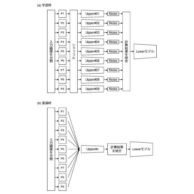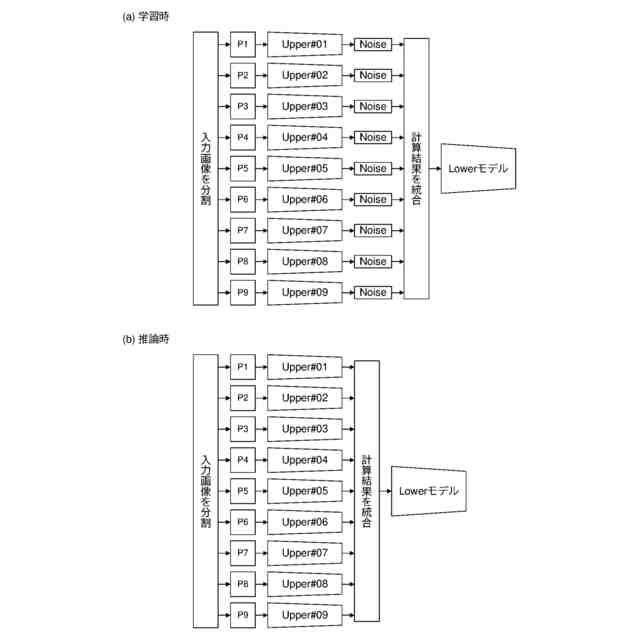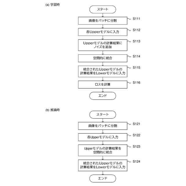 情報処理方法に係る第1実施形態について図1乃至図5を参照して説明する。先ず、画像認識の深層学習に係る情報処理方法について説明する。本実施形態では、学習に用いられる画像が複数のパッチに分割される。本実施形態では、学習用モデルの構成として、パッチ分割ニューラルネットワーク(Patch Split Neural Network)が用いられる。学習用モデルは、例えば、CNN(Convolutional Neural Network)が、UpperモデルとLowerモデルとの2つに分割されたモデルであってよい。
