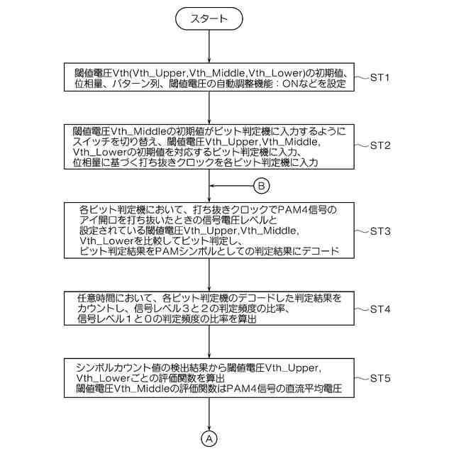 PAM4信号の信号レベルが2か3かを判定するための第1の閾値電圧(Vth_Upper)、前記PAM4信号の信号レベルが1か2かを判定するための第2の閾値電圧(Vth_Middle)、前記PAM4信号の信号レベルが0か1かを判定するための第3の閾値電圧(Vth_Lower)がそれぞれ任意に設定されている状態で任意時間におけるPAMシンボルとしての判定結果をカウントし、前記信号レベルが3と2の判定頻度の比率と、前記信号レベルが1と0の判定頻度の比率をシンボルカウント部(13a)により算出するステップと、
