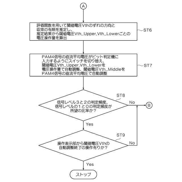 前記A/Dコンバータにより検出した前記PAM4信号の直流平均電圧の電圧値になるように前記第2の閾値電圧を調整制御し、前記信号レベルが3と2の判定頻度が所望の比率になるように前記第1の閾値電圧を調整制御し、前記信号レベルが1と0の判定頻度が所望の比率になるように前記第3の閾値電圧を調整制御する制御部8とを備えたことを特徴とする。