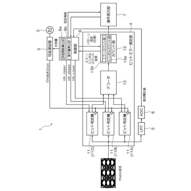 PAM4信号の信号レベルが2か3かを判定するための第1の閾値電圧(Vth_Upper)、前記PAM4信号の信号レベルが1か2かを判定するための第2の閾値電圧(Vth_Middle)、前記PAM4信号の信号レベルが0か1かを判定するための第3の閾値電圧(Vth_Lower)がそれぞれ任意に設定されている状態で任意時間におけるPAMシンボルとしての判定結果をカウントし、前記信号レベルが3と2の判定頻度の比率と、前記信号レベルが1と0の判定頻度の比率を算出するシンボルカウント部(13a)と、