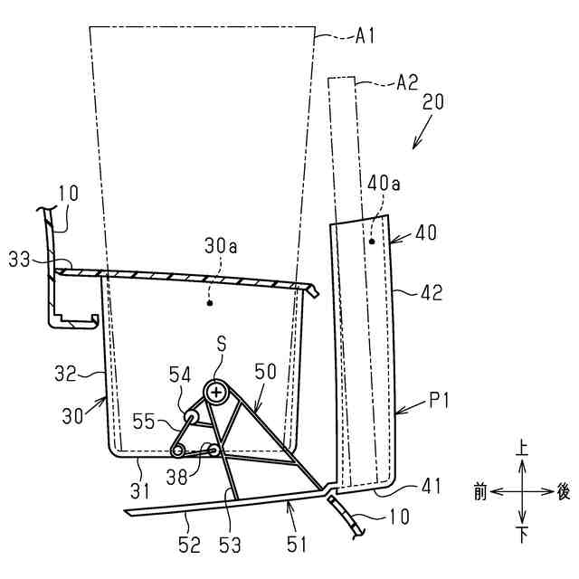 [態様3]前記第2収容部を前記第1収容部に対して回転可能に連結する連結部と、前記連結部と前記第1収容部とに接続され、前記第1収容部に対する前記第2収容部の回転時の位置が前記第1位置と前記第2位置との間の中間位置を越えたときに前記連結部の付勢方向を反転させる付勢部材と、を有しており、前記付勢部材は、前記第2収容部が前記第1位置と前記中間位置との間に位置するときには、前記第2収容部が前記第1位置に向かう方向に前記連結部を付勢し、前記第2収容部が前記第2位置と前記中間位置との間に位置するときには、前記第2収容部が前記第2位置に向かう方向に前記連結部を付勢する、[態様1]または[態様2]に記載の車両用ホルダ装置。