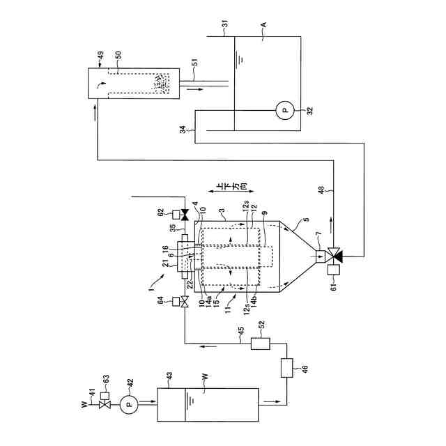 特許文献1に開示される従来のろ過システムでは、噴射ノズルが設けられており、洗浄流体をろ過手段に吹き付けて、ケーキを剥離させるものであるが、洗浄流体の吹き付けは、ろ過手段の損傷の原因となる。他方、本態様のろ過システムは、ろ過手段を上下動させることによってケーキの剥離を促進するものであり、洗浄流体の吹き付けを行うものではないので、ろ過手段が損傷しにくいものとなっている。
