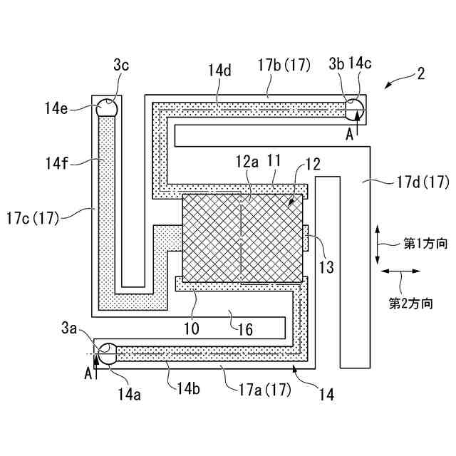 前記第3電極に接続される第3配線を内包する第3支持脚と、