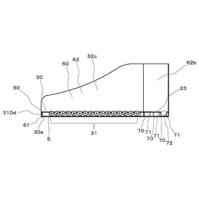 前記回動補助部は、前記Uターン押出収納板を下方側から支持する保持器と、前記保持器内部に収納し、且つ前記Uターン押出収納板の前記複数の孔部から一部分が突出する球状のメイン転動球とを設けた点にある。