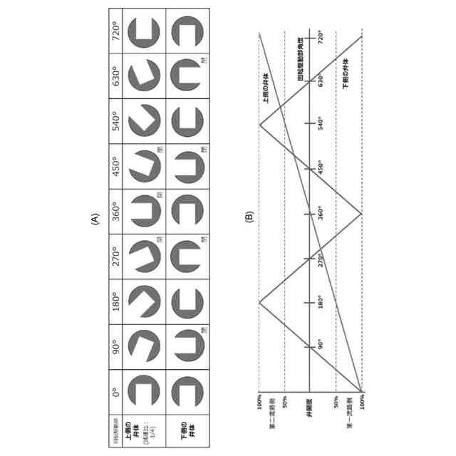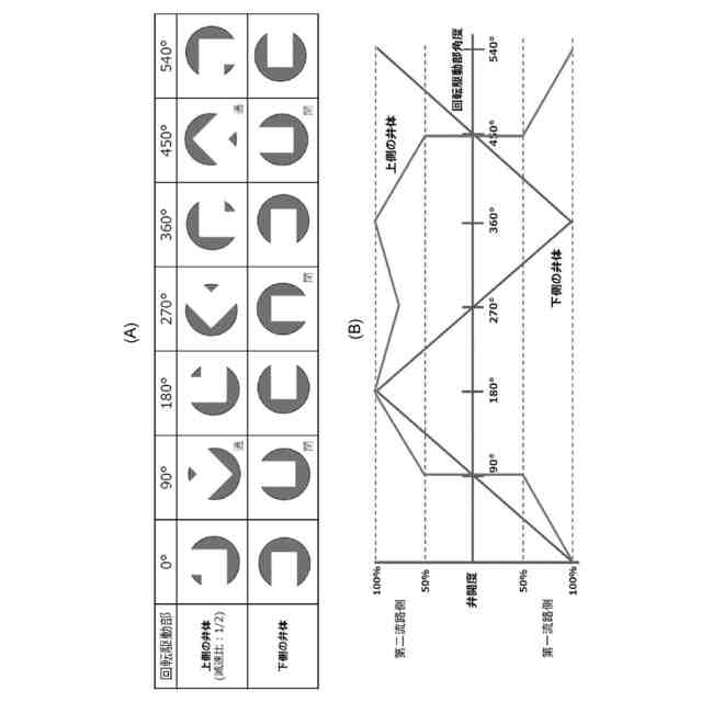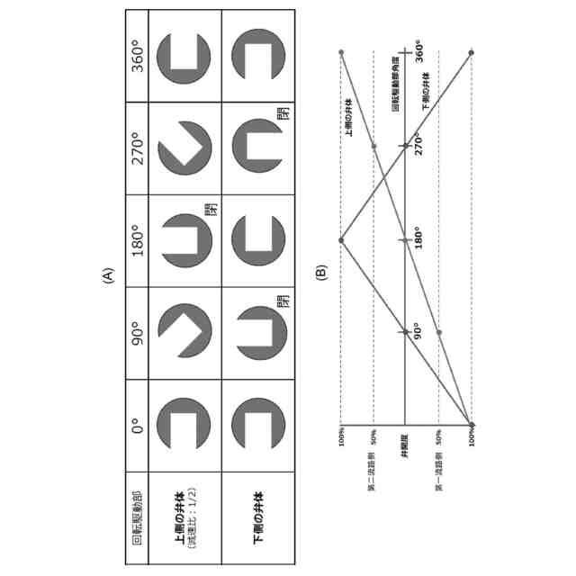 この流路切換弁では、上下2つの弁体を1つの回転駆動部により回転させて、流路を切り換える。このとき、歯車機構により一方の弁体を他方の弁体より減速して回転させるので、2つの弁体の回転角度に差が生じる。このため、2つの弁ユニットを互いに異なる切換えモードにすることができる。