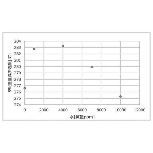 実施例で調製した組成物の水の濃度とキャスト板の5%重量減少温度との関係を示すグラフである。