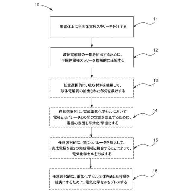 【解決手段】方法は、活性物質及び導電材料を液体電解質と混合することによって半固体電極材料を形成することと、前記半固体電極材料を集電体上に配置することと、前記液体電解質の一部を抽出し、及び前記高密度化半固体電極を形成するために前記半固体電極材料を圧縮することと、を含み、前記高密度化半固体電極が、体積で約60%~約85%の活性物質を含む。