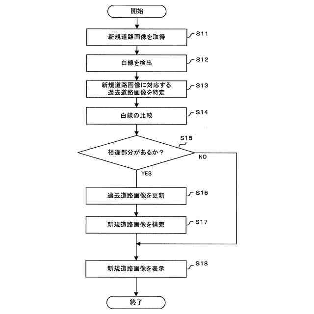請求項2に記載の発明は、道路に関する事物を含む新規道路画像を取得する画像取得手段と、記憶手段に記憶された道路画像と前記新規道路画像とに含まれる所定の前記事物の前記新規道路画像における欠損部分を前記道路画像に基づき補完する補完手段と、を備える。