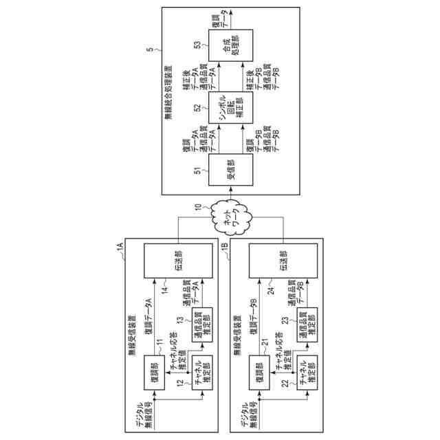 図1は、実施形態に係わる無線通信システムの一例を示すブロック図である。このシステムは、それぞれ共通のデジタル無線信号を受信する複数の無線受信装置1A,1Bと、無線統合処理装置5とを備える。デジタル無線信号は、例えばQPSK(Quadrature Phase Shift Keying)方式でデジタル変調されている。無線受信装置1A,1Bは、それぞれ受信したデジタル無線信号に基づく通信信号を、ネットワーク10を経由して無線統合処理装置5宛てに送信する。この通信信号は、ネットワーク10を経由して無線統合処理装置5で受信される。