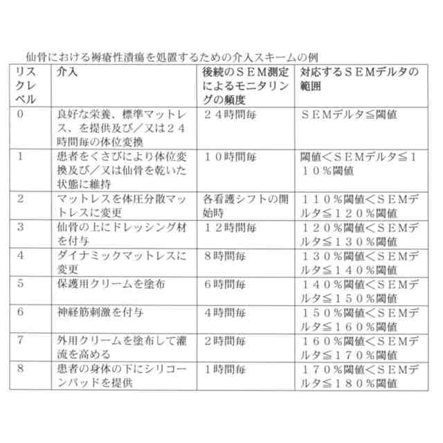 一態様においては、本開示は、これを必要とする患者において褥瘡性潰瘍の発症の進行を遅らせる方法であって、患者が受けたレベル-Kの現在の介入を特定するステップと、患者の複数の表皮下水分(SEM)測定を行うステップと、複数のSEM測定の一部からデルタ値を算出するステップと、デルタ値が第一の閾値を超えるか否かを判断するステップと、デルタ値が第一の閾値を超えていなければ現在の介入の施与を継続するステップと、デルタ値が第一の閾値を超えていなければレベル-Kに対応する予め決定された頻度で複数のSEM測定を行うことを継続するステップと、デルタ値が第一の閾値を超えていればレベル-Nの新規介入を施与するステップであって、NはKより大きい値を有するものである、上記レベル-Nの新規介入を施与するステップと、デルタ値が第一の閾値を超えていればレベル-Nに対応する予め決定された頻度で複数のSEM測定を行うステップとを含む方法を、提供し、且つ含む。さらなる態様においては、本開示は、デルタ値が第二の閾値未満であるか否かを判断することと、デルタ値が第二の閾値未満であればレベル-Lの介入を施与することであって、LはK未満のマイナスでない値を有するものである、上記レベル-Lの介入を施与することと、デルタ値が第二の閾値未満であればレベル-Lに対応する予め決定された頻度で複数のSEM測定を行うこととを、提供し、且つ含む。
