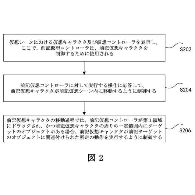 【解決手段】方法は、仮想シーンにおける仮想キャラクタ及び仮想コントローラを表示するステップであって、仮想コントローラは、前記仮想キャラクタを制御するために使用されるステップと、仮想コントローラに対して実行する操作に応答して、仮想キャラクタが仮想シーン内に移動するように制御するステップと、仮想キャラクタの移動過程では、仮想コントローラが前記仮想シーン内の第1領域にドラッグされ、且つ仮想キャラクタの周りの一定範囲内にターゲットのオブジェクトがある場合、仮想キャラクタが前記ターゲットのオブジェクトに関連付けられた所定の動作を実行するように制御するステップとを含む。