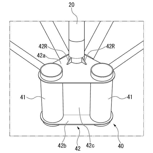 トランジションピース10は、ジャケット構造体100の上端に配置され、洋上風車300の下端が接続される部位である。図3に示すように、トランジションピース10は、平面視において十字状である。トランジションピース10の十字状の各外端には、レグ20が配置される。