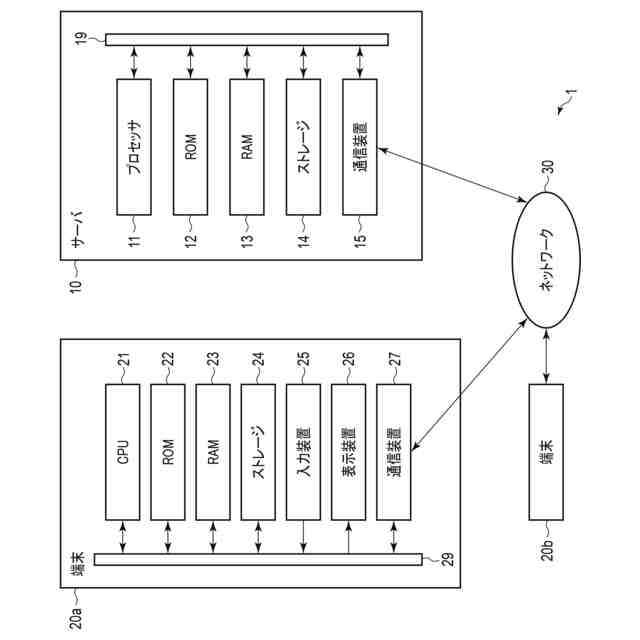 本発明の一実施形態について図面を参照して説明する。図1は、本発明の一実施形態に係るシステム1の構成の一例を示す図である。システム1は、サーバ10と、端末20a、20bとを含むサーバ-クライアントシステムである。サーバ10と端末20a、20bとは、ネットワーク30を介して通信可能に接続される。ネットワーク30は、例えばインターネットである。端末の台数は2台に限定されない。