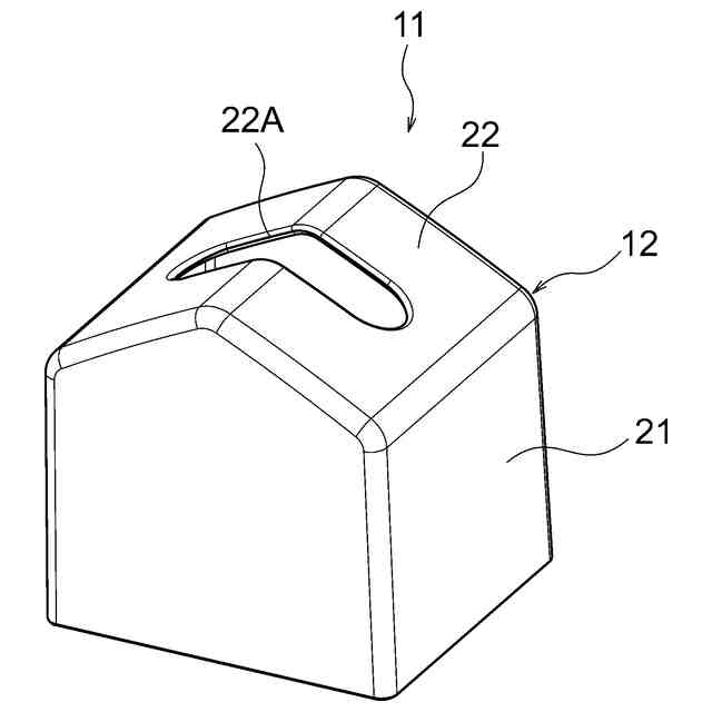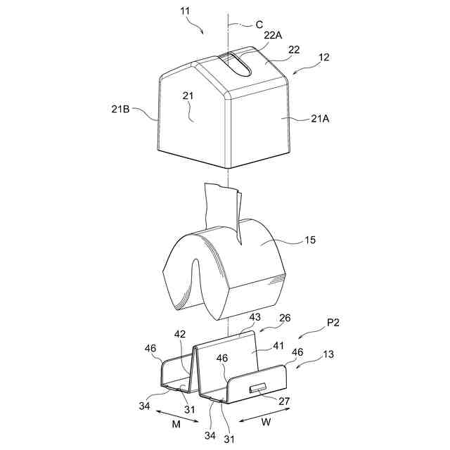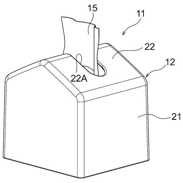【解決手段】側壁部21と、頂壁部22と、頂壁部に設けられペーパー15を取り出し可能な取出口22Aと、側壁部に設けられた一対の第1係合部と、を有する箱状の第1ケース12と、ペーパーを支持可能に頂壁部に向けて凸になった隆起部と、隆起部の頂壁部に近い位置の端部とは反対側の端部から外側に向けて延びる一対の平坦部と、一対の平坦部の略中央部に設けられた一対の指掛部と、一対の平坦部のそれぞれの外側から頂壁部に向けて延びる一対の縦壁部と、一対の縦壁部にそれぞれ設けられ一対の第1係合部と係合可能な一対の第2係合部と、を有し、少なくとも隆起部が第1ケース内に収められる第2ケースと、を備える。