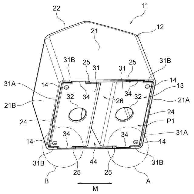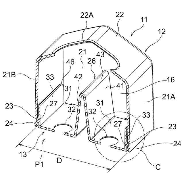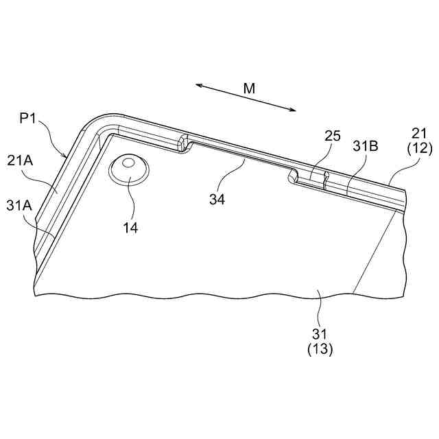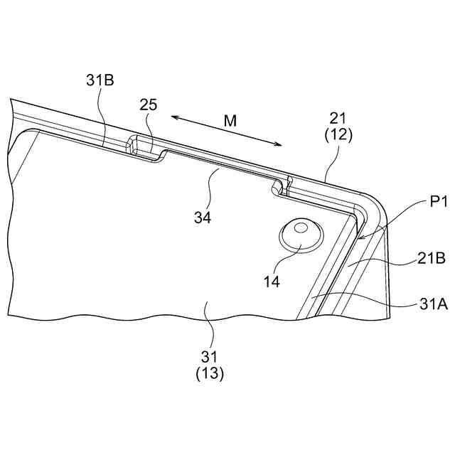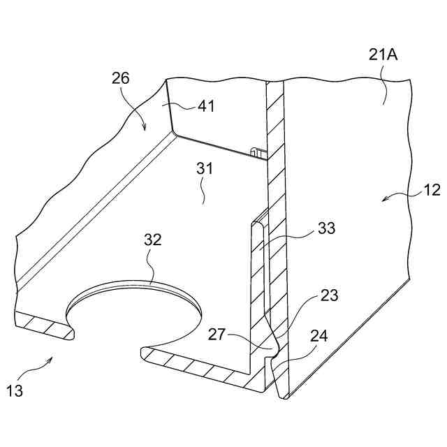 前記側壁部の下端部は、前記ストッパー部を受容可能な受容部であって、前記第1壁部に対して近づく方向の前記第2壁部の移動に伴い移動する前記ストッパー部の移動方向に関して、前記ストッパー部の寸法よりも大きく形成されるとともに、前記移動方向に関する前記ストッパー部の移動を許容する受容部を有する。