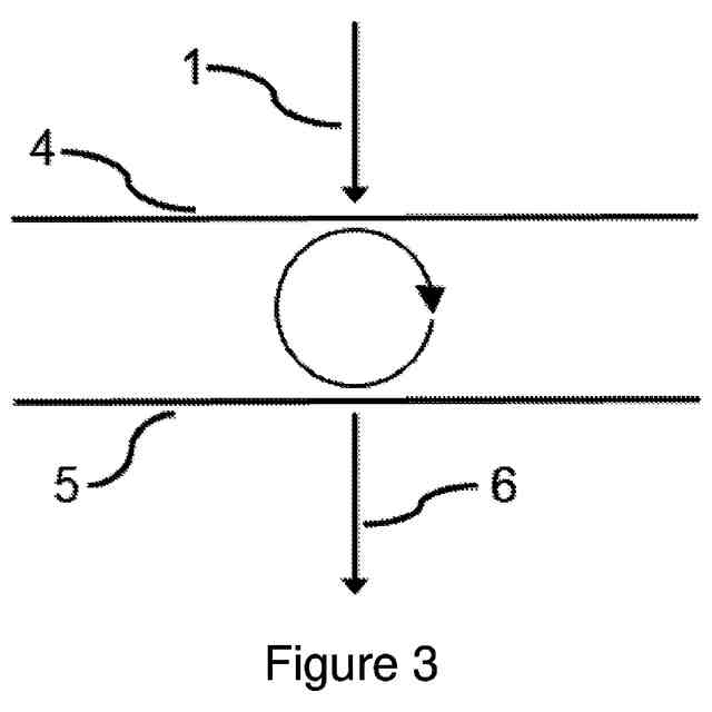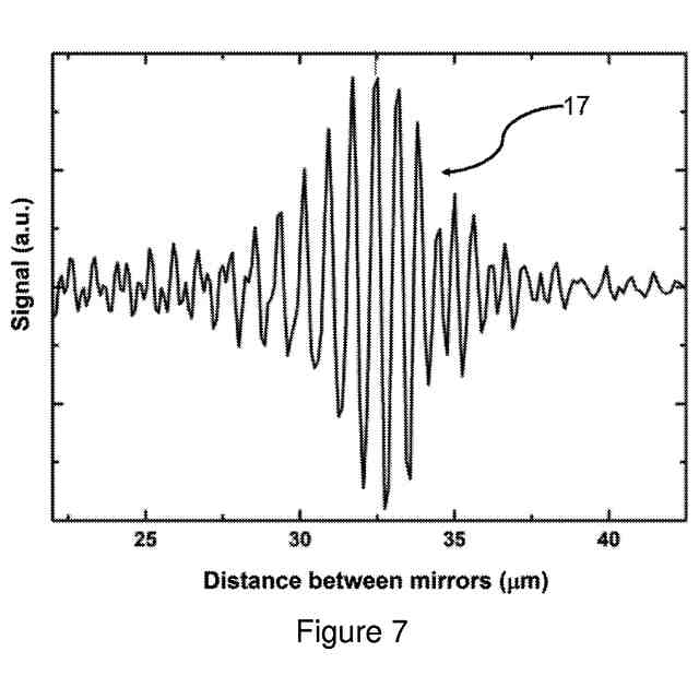 ファブリ-ペロー干渉計は図3に示されている。サンプル上に入射している光1は、第1のミラー4を通して、2つの平行なミラー4とミラー5との間に形成されたキャビティ内へと伝えられる。光1は、ミラー4とミラー5との間で反射され、キャビティサイズと共振する光1の波長のみが第2のミラー5を通して伝えられることになり、光6が次いで、検出器上に進む。ミラー4とミラー5との間の距離は変更することができ、それにより、ユーザは、光の異なる波長を通してスキャンすることができる。この方法で、分光計は、様々な波長を通して動くことができ、吸収スペクトルを構築する。