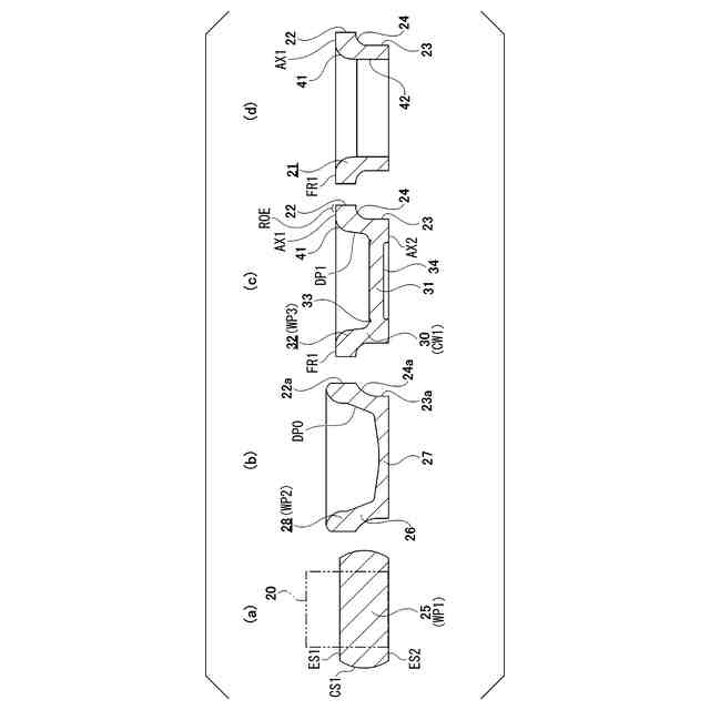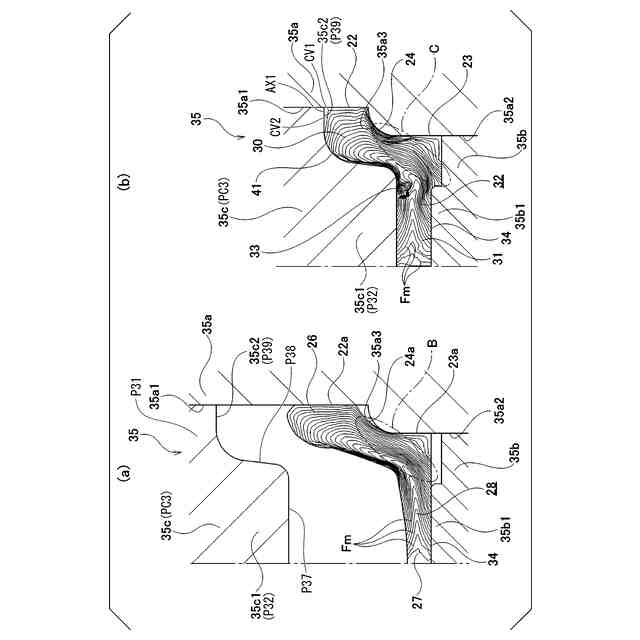 (b)前記第2工程は、第2パンチを用いて予備窪みを前記ワークピースに形成し、その後に、第3パンチを用いて前記窪みと前記鍔と前記第1軸面とを前記ワークピースに同時に形成する工程を有し、前記窪みと前記鍔と前記第1軸面との同時形成は、前記径方向外端部における前記鍔の角を充実させることを含む、