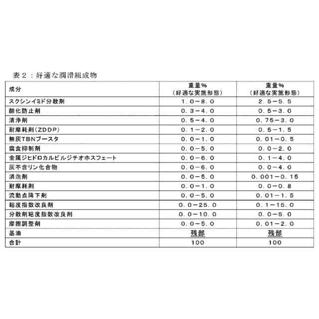 潤滑剤の仕様は、多くの場合、硫酸灰分、リン及び硫黄の許容レベルに関する組成的制約(いわゆるSAPS制限)を含み、最新の潤滑剤規格の高まる要求を依然として満たしながら、このような制約を維持することは、困難である傾向がある。例えば、環境への配慮から、粒子状物質及び他の様々な排出物を低減するために、排気後処理装置が車両に取り付けられることが多い。しかしながら、内燃機関に従来使用されている潤滑油組成物の硫酸灰分、硫黄及び/又はリン濃度は、そのような後処理装置に悪影響を及ぼす可能性があり、潤滑剤は、一般に、その中の硫酸灰分、リン及び硫黄を最小限に抑えるように配合される。