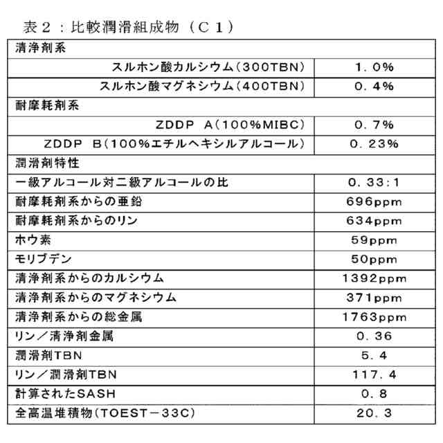 硫酸灰分は、潤滑油組成物中の灰分の総重量パーセントを示す測定値である。潤滑油組成物の硫酸灰分測定値は、その中の総金属含有量に関連しており、ASTM D-874及び/又は当該技術分野において既知であり、かつ本明細書に記載されるような他の一般的な評価方法に従って便利に測定され得る。しかしながら、多くの状況において、特定の性能特性を改善するために潤滑剤組成物内の1つの成分を変動させることは、1つ以上の他の性能特性に悪影響を及ぼす傾向がある。例えば、潤滑油組成物中の灰分の主要な供給源は、概して、金属清浄剤添加剤及び/又は耐摩耗剤添加剤である。しかしながら、硫酸灰分含有量を低減するために清浄剤又は耐摩耗剤成分の量を低減することは、他の性能特性に悪影響を及ぼす傾向があり、特に、清浄剤及び/又は耐摩耗剤の低減は、例えば、TEOST-33Cの高温性能試験において堆積物を増加させる傾向があることが発見された。