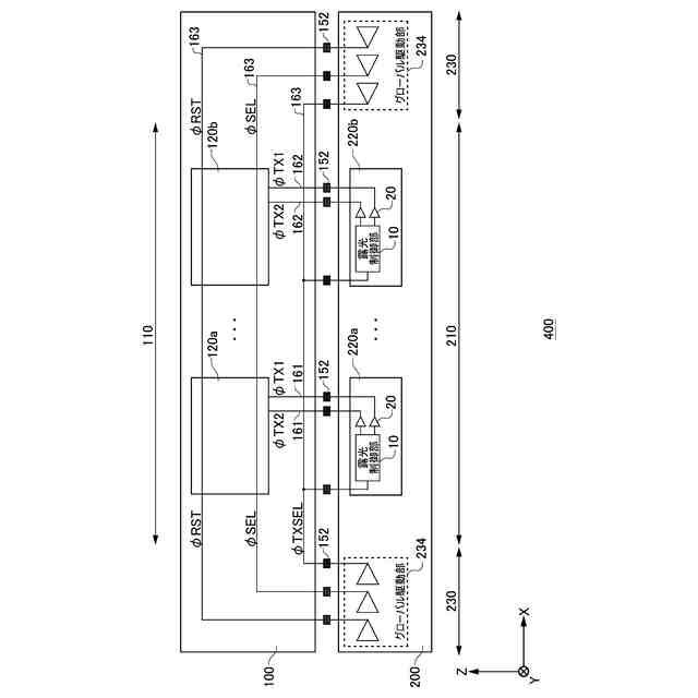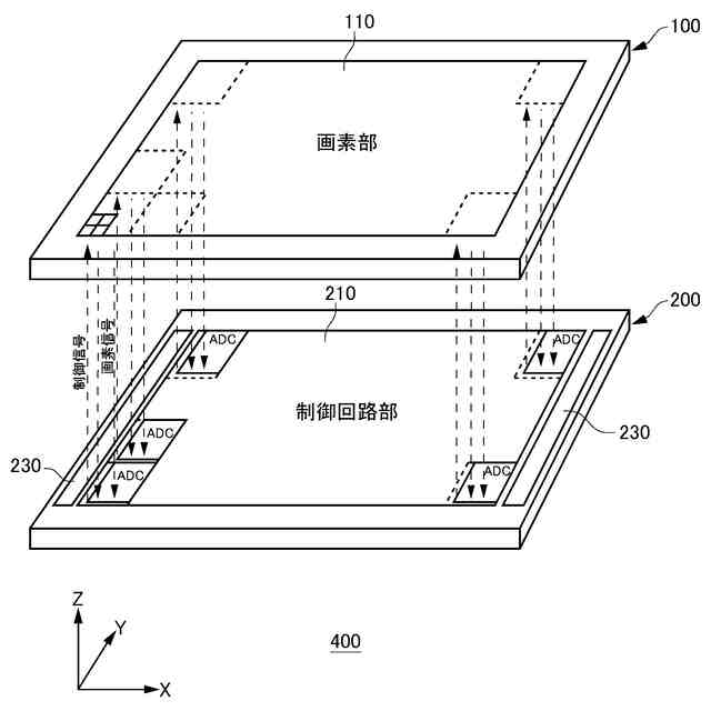 本明細書において、X軸とY軸とは互いに直交し、Z軸はXY平面に直交する。XYZ軸は右手系を構成する。Z軸と平行な方向を撮像素子400の積層方向と称する場合がある。本明細書において、「上」及び「下」の用語は、重力方向における上下方向に限定されない。これらの用語は、Z軸方向における相対的な方向を指すに過ぎない。なお、本明細書では、X軸方向の配列を「行」とし、Y軸方向の配列を「列」として説明するが、行列方向はこれに限定されない。