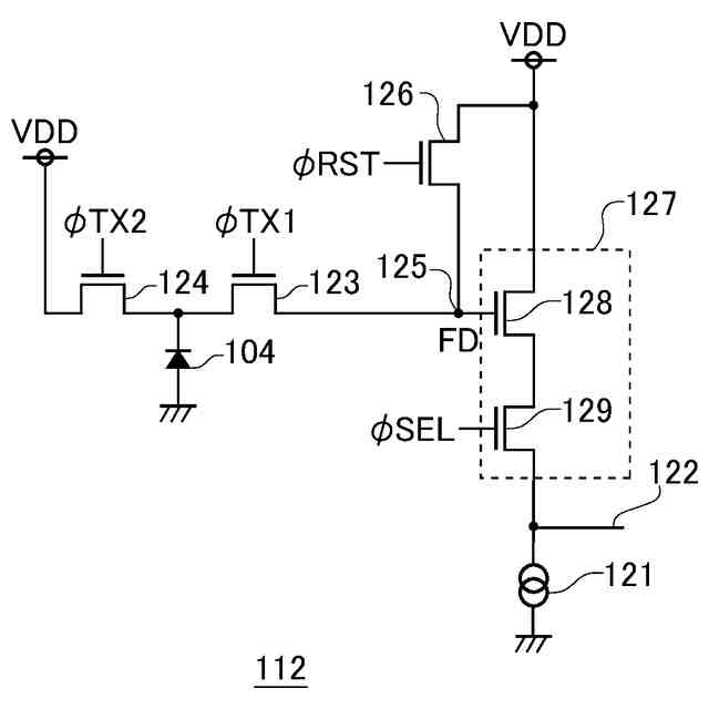 光を電荷に変換する光電変換部であって行方向において前記第1光電変換部と並んで配置される第2光電変換部と、前記第2光電変換部で変換された電荷を転送する第2転送部と、前記第2転送部により前記第2光電変換部で変換された電荷が転送される第2蓄積部と、前記第2蓄積部に電気的に接続される第2増幅部と、前記第2増幅部に電気的に接続される第2選択部とを含む第2画素ブロックと