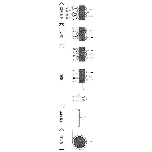 前記の端部皮膜が除去されたセグメントをコイル状に加工してセグメントコイルとし、固定子コアのスロットに組み込む工程と、