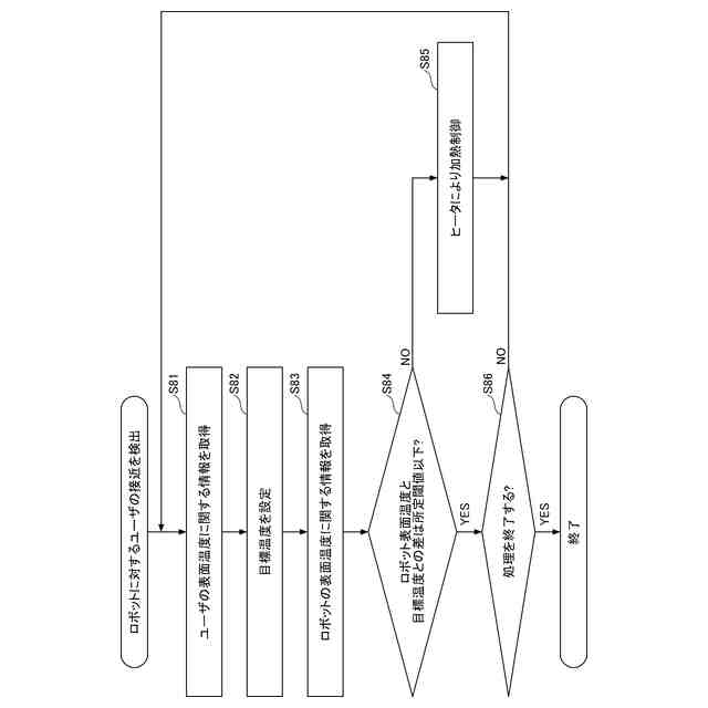 【解決手段】本発明の一態様に係るロボットは、ユーザに接触可能なロボットであって、前記ロボットに対して前記ユーザが接近したことに関する情報を出力する第1検出部と、前記ロボットの表面温度を可変する可変部と、前記第1検出部が取得した情報に基づき、前記ロボットの表面温度が所定温度になるように、前記可変部の動作を制御する制御部と、を有する。