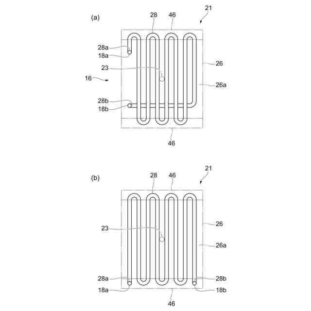 (a)はディスク部の冷媒配管に係る第1実施形態を模式的に示す平面図、(b)はディスク部の冷媒配管に係る第2実施形態を模式的に示す平面図である。